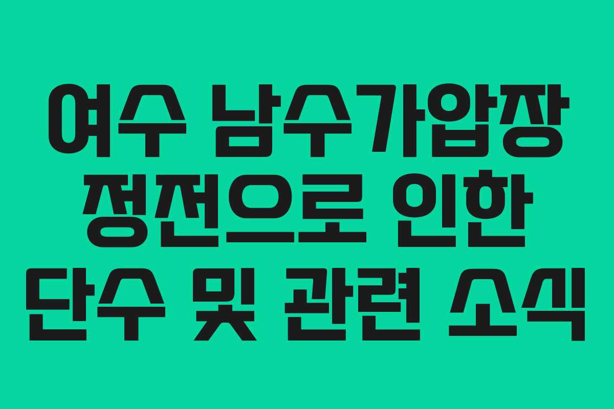 여수 남수가압장에서 발생한 정전은 상수도 공급에 큰 영향을 미쳤습니다. 이로 인해 해당 지역 주민들은 물 공급이 중단되어 불편을 겪고 있습니다. 현재 여수시는 복구 작업을 진행 중이며, 빠른 시일 내에 정상적인 물 공급이 이루어질 것으로 보입니다.