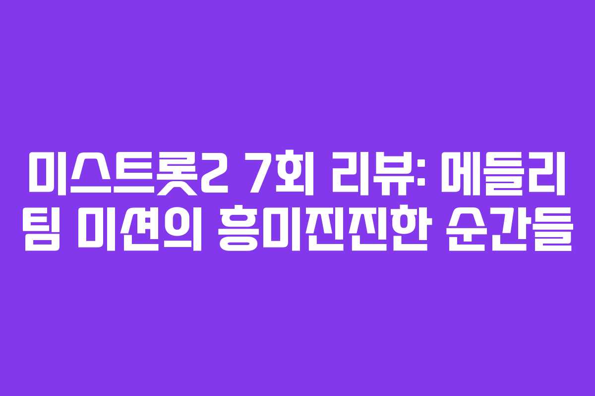 미스트롯2는 112팀으로 시작하여 본선 3차전에서 25명의 참가자가 남아 명승부를 펼치고 있습니다. 오디션 프로그램의 특성상 탈락자가 생기는 만큼, 매회 긴장감 넘치는 경연이 이어지고 있습니다. 이번 7회에서는 메들리 팀 미션이 진행되었으며, 지난 6회의 1:1 데스매치 결과가 이번 회차에 큰 영향을 미쳤습니다.