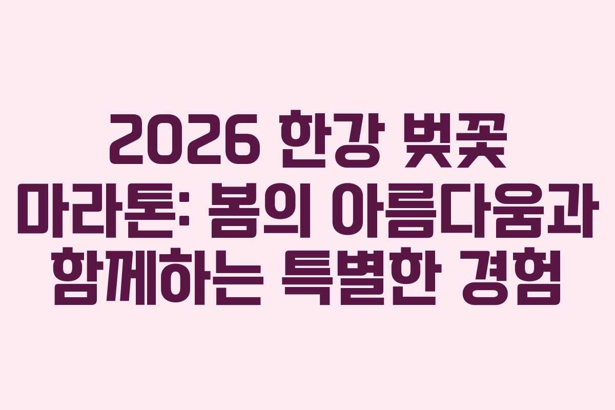 2026 한강 벚꽃 마라톤은 자연의 아름다움과 건강을 함께 챙길 수 있는 뜻깊은 행사입니다. 많은 참가자들이 함께 벚꽃길에서 특별한 추억을 만들어가기를 바랍니다. 이 기회를 통해 소중한 사람들과 함께 건강한 봄날을 즐기세요.