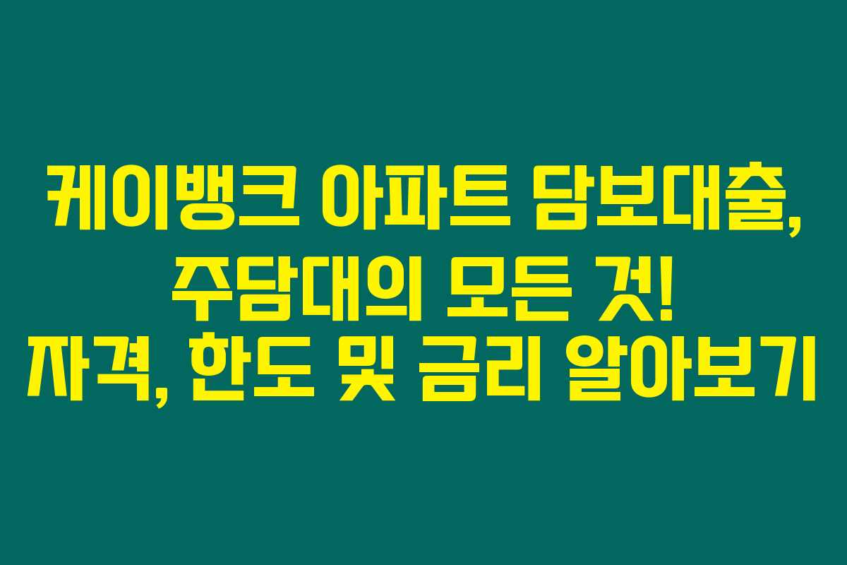저는 최근에 케이뱅크 아파트 담보대출에 대해 자세히 알아본 결과, 요즘처럼 금리가 높은 시점에서 대출을 받으려는 분들께 유용한 정보가 될 것 같아요. 아래를 읽어보시면 주택담보대출 자격, 한도, 금리, 재상환 방법 등 다양한 정보를 쉽게 이해하실 수 있을 거예요.