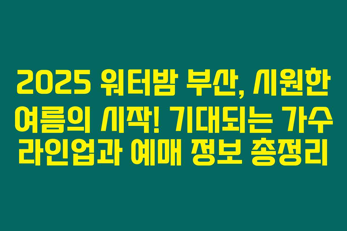부산의 여름을 대표하는 축제인 2025 워터밤 부산에 대한 설렘이 점점 커지고 있습니다. 물총과 함께하는 화려한 공연, 그리고 전국 최고의 아티스트들이 함께하는 이 축제를 놓치고 싶지 않으시죠? 아래를 읽어보시면 이번 행사에 대한 모든 정보를 확인할 수 있습니다.