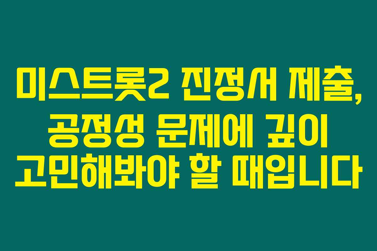 미스트롯2를 지켜보고 계신 분이라면 최근 방송에서 발생한 여러 논란에 대해 걱정하고 계실 텐데요. 방송의 공정성에 의문을 제기하는 진정서 제출 사건이 발생하며 팬들과 지원자들 사이에서 불안감이 퍼지고 있습니다. 미스트롯2 진정서 제출과 관련한 문제에 대해 아래를 읽어보시면 깊이 이해할 수 있을 거예요.