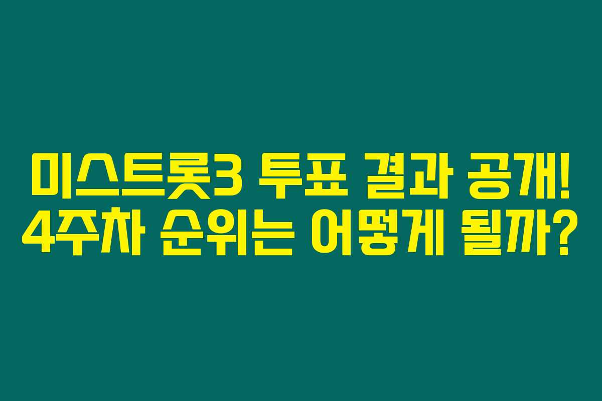 미스트롯3의 4주차 투표 결과가 발표되었습니다! 이 프로그램을 사랑하는 여러분이라면 이번 순위 변화에 관심을 두고 계실 텐데요. 만약 미스트롯3 투표 결과에 대해 궁금하신 분들이라면 지금 바로 확인해보세요!