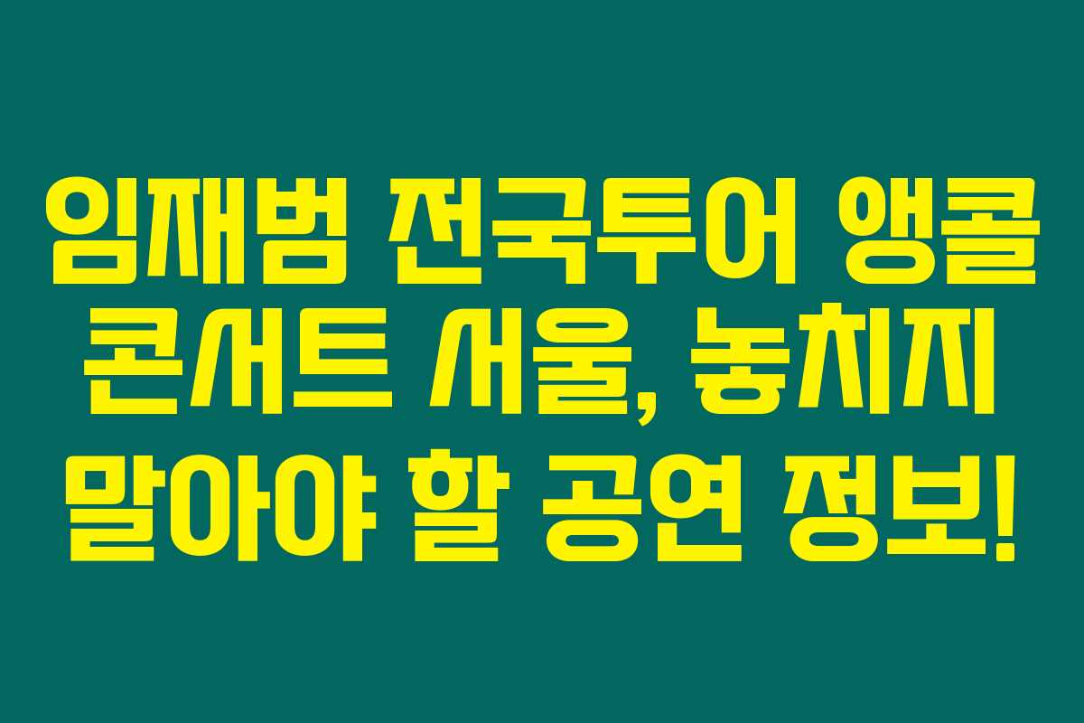 2023년 임재범 전국투어 앵콜 콘서트의 서울 공연 소식이 들려왔어요! 이 특별한 순간을 통해 그가 전하는 감동과 음악을 직접 느낄 수 있는 기회인데요. 만약 임재범 팬이라면 이번 공연 정보와 예매 방법을 꼭 확인해 봐야 해요. 아래를 읽어보시면 티켓 오픈 일정과 예매 안내 등에 대한 유용한 정보가 가득하니 놓치지 마세요!