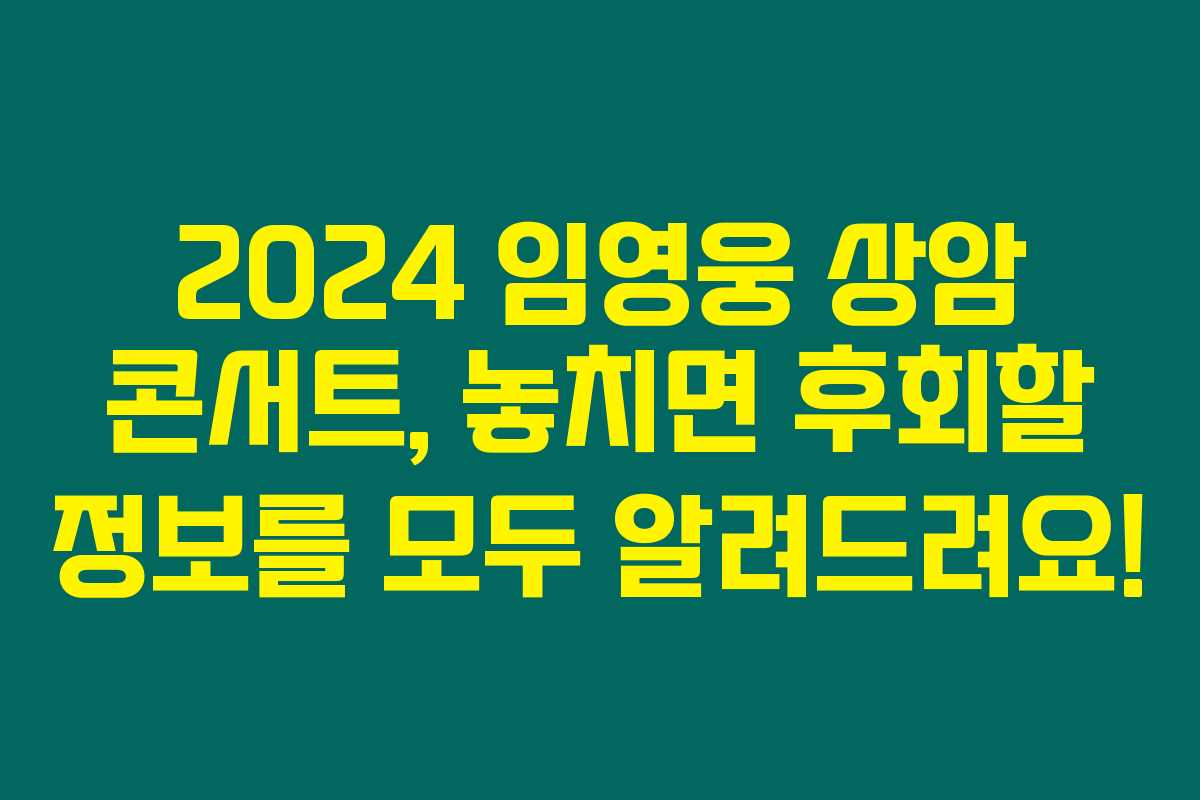 이번 2024 임영웅 상암 콘서트를 통해 많은 감동의 순간을 공유하게 되기를 바라요! 임영웅의 음악이 여러분의 마음을 사로잡을 준비가 되어 있답니다. 티켓 예매에 성공하셔서 특별한 기억을 만들어주세요!